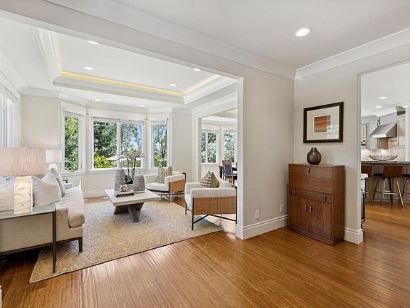 Set beyond a gate on a spacious level lot, this newer home offers luxurious quality with an open and bright floor plan. Bamboo floors with a hewn finish, coved crown moldings, solid wood doors, and up-lit tray ceilings exemplify the quality details found throughout. The open design revolves around a spacious foyer with a formal living room, dining area, chefs kitchen with breakfast bar, and family room. There is a dedicated office, perfect for todays work-from-home needs, plus 3 upstairs bedrooms, including the primary suite with Western hill views and marble bath.