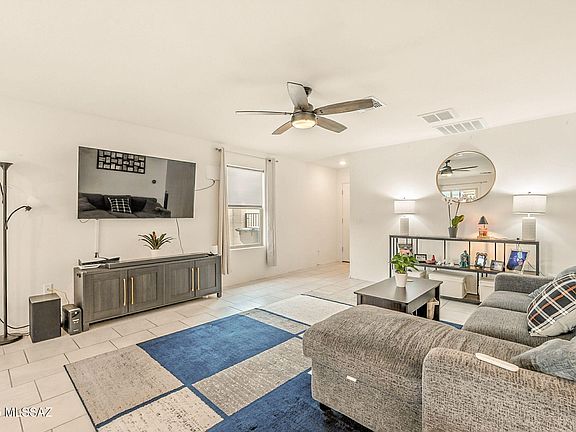 Beautifully maintained all-electric home with tile flooring and ceiling fans throughout. Open-concept design features a kitchen island/breakfast bar, stainless steel appliances, reverse osmosis, and water softener. Split-bedroom floor plan, Ethernet connections, smart light switches, LED lighting and exterior security cameras. Freshly painted garage. Enjoy the new outdoor Ramada, extended concrete patio, and festive lighting - perfect for entertaining. Corner lot at the back of the neighborhood for added privacy. Community offers a park, pool, nature trails and sidewalks. Conveniently located near schools, shopping, restaurants, medical services, and easy I-19 access.