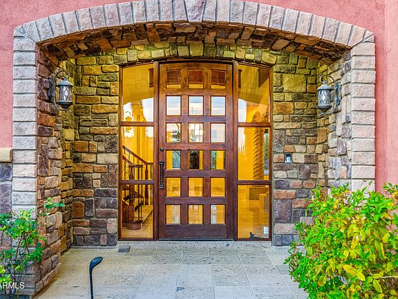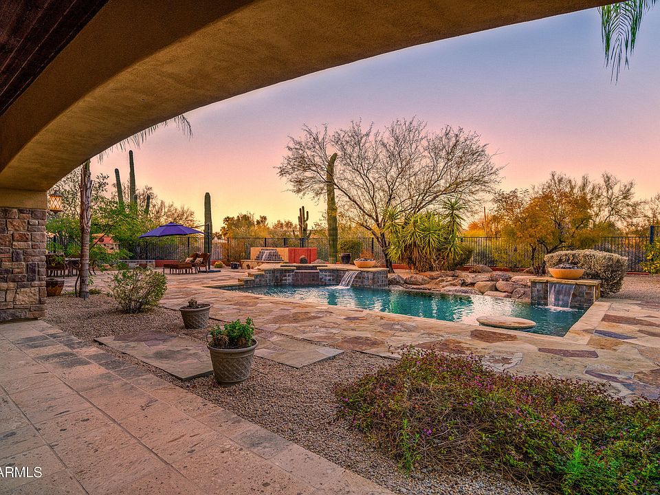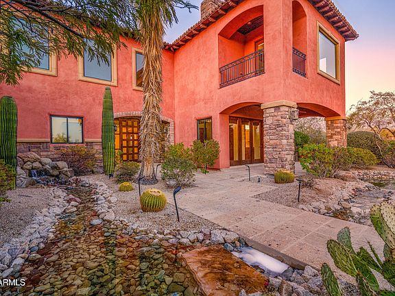 Set on 2.3 acres in the heart of North Scottsdale, this stunning 5,070 sq. ft. custom Tuscan-style home perfectly combines luxury, comfort and the natural beauty of the desert. With 5 bedrooms, 4.5 baths, a 3-car garage and a private office featuring its own balcony, this property is designed to cater to both relaxation and entertainment. Upon arrival, you'll be greeted by a grand entrance, soaring ceilings and intricate architectural details. The striking floating staircase takes center stage, as you step inside. The chef's kitchen is equipped with premium appliances, custom cabinetry and a spacious island, while the expansive great room features a dramatic floor-to-ceiling stone fireplace and oversized windows that merge indoor and outdoor living seamlessly. The primary suite serves as a tranquil retreat with a massive walk-in closet, a luxurious stone snail shower, his-and-her vanities and a cozy sitting area showcasing breathtaking 180-degree mountain views. Each guest bedroom is thoughtfully designed with its own ensuite for maximum comfort and privacy. The office/optional bedroom offers access to a covered balcony overlooking the sparkling pool and patio. Step into the fenced backyard oasis, complete with a heated pool and spa accented by built-in water features. The outdoor space also boasts a built-in BBQ and wood-burning fireplace, perfect for year-round gatherings. With 2.3 acres, there's plenty of room to add a guest casita or detached garage. Situated in prestigious North Scottsdale, this home offers privacy while remaining close to world-class golf courses, upscale dining, and premier shopping. Don't miss the chance to own this exceptional Tuscan-inspired retreat in the stunning Sonoran Desert!