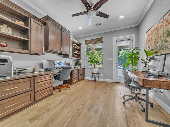 Inside, you’ll find soaring ceilings, rich wood floors, and designer finishes that flow throughout the open-concept layout. The spacious family room is anchored by a gorgeous stone fireplace and opens seamlessly to the gourmet kitchen featuring an oversized quartz island, high-end stainless steel appliances, custom cabinetry, and a walk-in pantry—ideal for both everyday living and entertaining. A dedicated office with built-ins provides a quiet retreat for working from home or managing daily tasks.