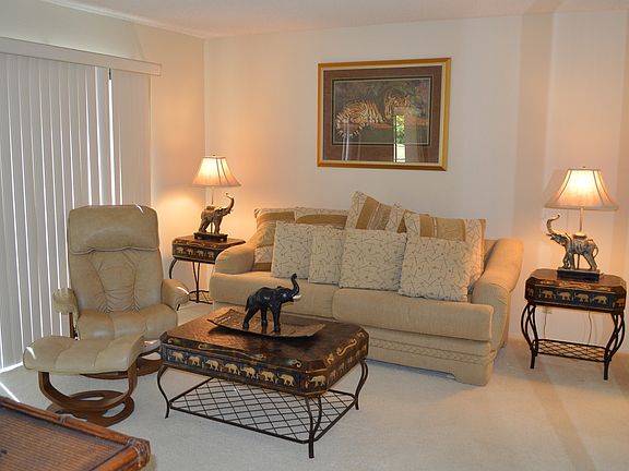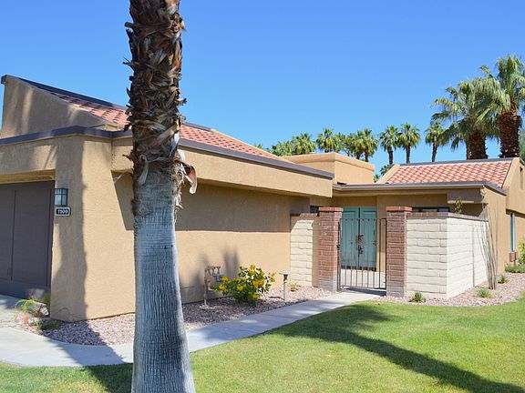 A PALM SPRINGS attached home.Level comfort and style. Formal entry leads to open living room with vaulted ceilings and open floor plan..2 Bedrooms/2 baths. The primary bedroom and bath suite features double sink,a large shower plus separate soaking tub. The 2nd bedroom has a bed with closet. Rear patio overlooks a huge pond with wild life, spacious green belt, 18 hole golf and sweeping mountain views. There is a gated front patio and open back view patio. Interior large side by side laundry. Over-sized 2 CAR GARAGE with automatic opener. Close proximity to pool and spa. A quiet, gated community with a guard on the WEST GATE in Palm Springs.This is a fully furnished villa-home. Seeking a long term tenant to reside. One small dog may be considered. Call for details. Views from the spacious rear patio, off the living room and primary bedroom, are wonderful.. 18 hole golf on site, golf fees not included. A community restaurant, Jack's, with Mountain views,plus an additional golf course through the adjacent MAIN GATE, including tennis is available. We are seeking a long-term occupant who appreciates the Palm Springs lifestyle.
