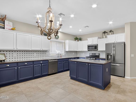 2-story home with 4 bedrooms, 2.5 baths, and a 3-car tandem garage with built-in storage. The first-floor primary suite includes a gorgeous updated walk-in shower and an oversized closet. The kitchen shines with two-toned cabinets—white uppers and blue lowers—while the neutral paint palette, updated floors, and brand-new carpet make this home move-in ready. Upstairs you'll find spacious bedrooms and plenty of natural light. Outside, enjoy a built-in natural-gas BBQ, an expansive ramada for entertaining, and a grassy area perfect for pets. Owner is a Licensed REALTOR in AZ. Anthem Merrill Ranch is established as a master plan community and features climbing indoor basketball, courts, fitness studio, fully equipped fitness center, and other great indoor activities. You can visit the Parkside Café, spend time with the resort-style pool featuring its waterslide or enjoy the separate lap and diving pool outside. You will have access to 60 acres of Park space with softball basketball, pickle ball, courts and other multipurpose fields. Your furry friends will also have a great time at the dog park or along the many trails for walking throughout the community. Start the vacation you never have to end with ample entertainment, a park with multiple playgrounds, and a catch and release fishing. This is all complete with a championship Troon golf course, seasonal events, and activities at the outdoor amphitheater.