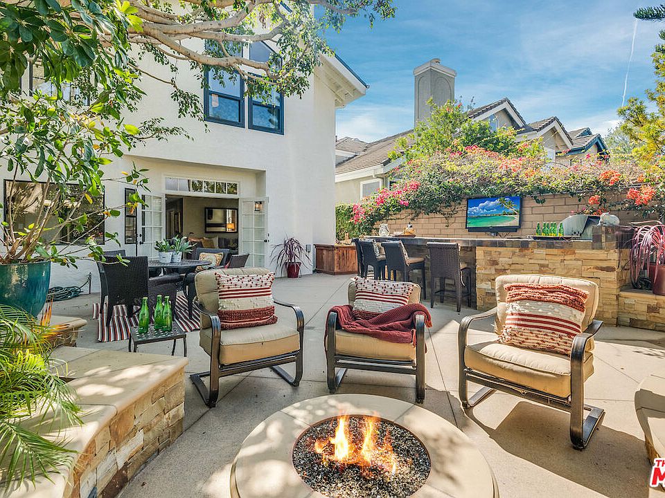 JUST REDUCED! Set on a lovely extra large corner lot at the gateway to Pacific Heights, this gracious home offers a wonderful mix of formal living & comfortable casual spaces to enjoy California's famed indoor/outdoor lifestyle. Double door entry opens to the sun-filled living room with spectacular 20-ft high vaulted ceilings, enormous windows framing two grand elm trees out front, sunny south-facing bay window, and vast walls for art. Adjacent formal dining room features French doors opening to the garden and easy flow to the kitchen, family/media/Great Room and backyard paradise. Main level office/den/4th bedroom with custom floor-to-ceiling bookshelves and rich solid hardwood floors. Down the hall awaits the warm & welcoming family/media/Great Room with wood with fireplace, updated kitchen with granite counters, breakfast bar, stainless appls, and charming breakfast room overlooking the lush back garden. And what a world awaits outside! This is an entertainers' dream featuring a custom outdoor kitchen w/huge wraparound bar, oversized gas grill, fridge and even an outdoor TV for watching all those big games, latest Disney hit or Succession season 3 at last! Lovely Italian-inspired fountain, gas fire pit/conversation circle, Sonos sound system, landscape lighting. Truly a breathtaking outdoor environment for relaxing and entertaining in grand style. Second level primary bedroom suite with high ceilings, sitting area with fireplace, sun-filled bath w/dual vanities, Roman tub overlooking the garden, separate shower, new cathedral skylights & spacious walk-in closet. Two additional sunny bedrooms and hall bath upstairs. All new roof 2021, new windows in living room & master bedroom, updated kitchen, Sonos sound system, attached garage. Here is your opportunity to live near the beach, the Ballona Wetlands, and enjoy the walkable streets of this friendly coastal neighborhood of Playa del Rey.