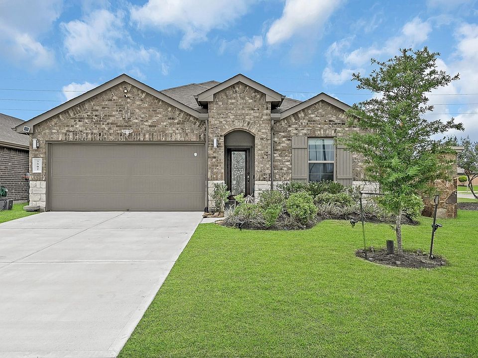This stunning residence offers an open floor plan with soaring ceilings and elegant large tile flooring throughout. The inviting casual dining area and spacious family room seamlessly flow into the gourmet kitchen, featuring granite countertops, a stylish tile backsplash, a large eat-in island with undermount stainless sink, tall cabinets, and premium stainless steel appliances. The primary suite boasts high ceilings, plush carpet, and a luxurious bath with dual vanities, an oversized walk-in shower, and a generous walk-in closet. Enjoy outdoor living on the covered rear patio—perfect for relaxing or entertaining. This home is move-in ready and won’t last long!