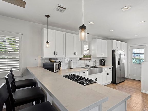 FRESH LOOKING INSIDE, SINGLE STORY HOME IN DOWNEY! Now a spacious Open Floor Plan 2 Bedroom, 2 Bath roomy 1,126 sq foot home is ready for you! (Tax records show 3 bedrooms, permitted work.) Entire home painted and all new Pergo flooring. Kitchen was remodeled with new cabinets, quartz counter tops, decorative lighting and Samsung stainless steel appliances, farmhouse sink and counter accommodates bar stool seating. Washer/dryer inside. Master Bedroom is light filled, mirrored closet doors, lighted ceiling fan, en-suite bathroom with stall shower. 2nd Bedroom is spacious with mirrored closets and ceiling fan. Garage is detached. Backyard is BIG and at the end of the block so wraps around the property and fenced to protect any TOYS! Lots of room for entertaining! New brick wall that helps with privacy. The long driveway can accommodate an RV. MAKE DOWNEY YOUR NEW HOME!!
