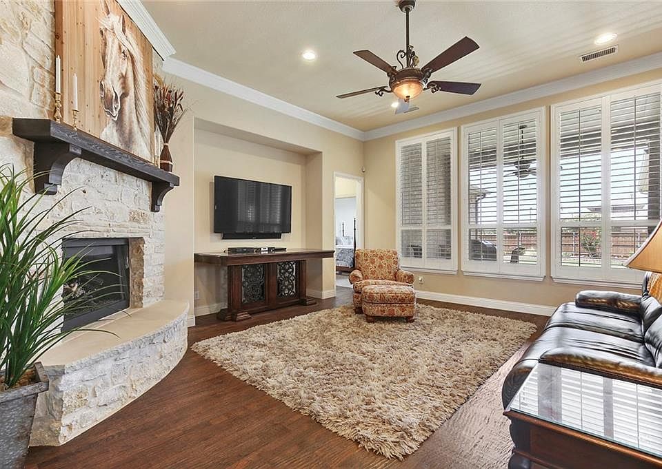 OWNER WILL FINANCE - Move-In Ready Highland Home with 4 Beds, 3.5 baths in Woodbridge and Wylie ISD. Very hard to find large lot just under .3 acre with beautiful landscape and plenty of room for a pool! Board on Board wood fence with steel post, covered porch, and extended patio is ideal for entertaining. Entire home has plantation shutters and upgraded fixtures! Downstairs has handscraped wood floors, granite in the kitchen with custom cabinets and stainless steel appliances, and extra desk area in kitchen. Master and 2nd bedroom down with own private bath. Side entry driveway with 3 car garage and extra concrete parking space, along with custom storage hanging racks making organization easy in garage!