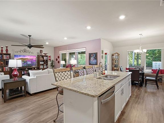 BETTER THAN NEW! Just 5 Years Young with Numerous Upgrades! This home features an inviting open floor plan with beautiful laminate wood flooring throughout, NO CARPET. The bright, spacious den includes new recessed lighting and plenty of natural sunlight. The large kitchen boasts granite countertops, stainless-steel appliances, and a convenient center island—great for easy meal prep. A sunny dining area completes the space. The primary bathroom offers a newly remodeled enlarged shower and granite vanity, plus a huge walk-in closet. Step outside to a relaxing covered patio overlooking a privacy-fenced backyard that backs to a wooded area for extra seclusion. Additional highlights include: interior laundry with cabinetry, a security system with new control panel (2025), new ceiling fans in all bedrooms, window blinds throughout, a 16’ x 17.5’ composite deck, French drainage system with sump pump, new Generac generator (2025), large storage shed, and a tankless water heater. The HVAC system was inspected and cleaned in 2025. Don’t miss this move-in-ready gem — come see it today!