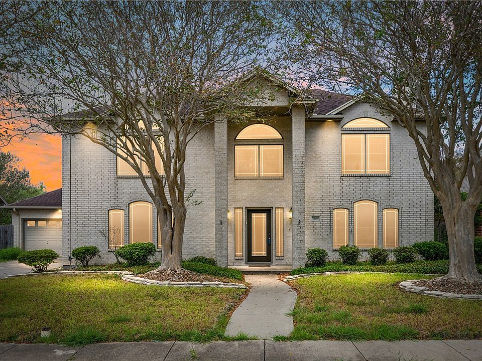 Welcome to this stately two-story home in Kings Crossing subdivision, offering 5 bedrooms, 2.5 baths, and a 2-car garage. With its classic brick exterior, mature trees, and inviting curb appeal, this home makes a beautiful first impression. Step inside to be greeted by a grand entry with a sweeping staircase that sets the tone for the spacious layout. The primary suite is conveniently located on the first floor, featuring a large bathroom retreat with a double vanity, garden tub, separate tiled shower, and a generous walk-in closet. The living and dining rooms flow seamlessly together, creating the perfect space for entertaining or relaxing. The kitchen offers abundant cabinetry and opens to both the dining area and a second breakfast nook, which leads to the covered back patio—an ideal spot for outdoor gatherings. Also on the first floor: a half bath, dedicated laundry room with cabinets and sink, and easy access to the two-car garage. Upstairs, discover four additional spacious bedrooms, a full bath, and a versatile landing area that works beautifully as a home office, gaming zone, or cozy reading nook. With plenty of space, flexible living areas, and a great location, this home is ready to welcome its new owners!