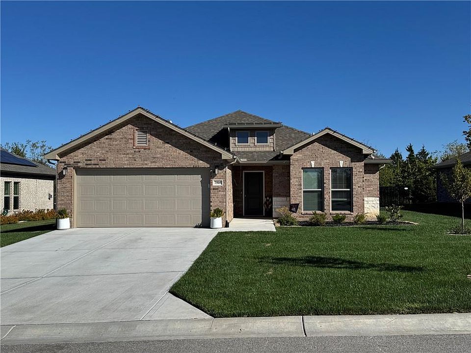 Welcome to Legacy Crossing—where modern comfort meets low-maintenance living! This nearly new, all-brick ranch home offers 3 bedrooms, 2 bathrooms, and a thoughtfully designed, single-level layout that makes everyday living a breeze. Built in 2023 and lightly lived in, it still feels brand new. Step inside to discover an open-concept floor plan with soaring ceilings, abundant natural light, and cozy gas fireplace in the living area. The spacious living room flows effortlessly into the contemporary kitchen, complete with granite countertops, black stainless steel appliances, a large center island, and stylish soft-close cabinetry—perfect for both entertaining and daily meals. The primary suite provides a private retreat with a walk-in closet, granite vanity, and a tiled walk-in shower. Two additional bedrooms offer flexible space for guests, a home office, or family, and share a well-appointed full bathroom. Outside, enjoy a fully fenced backyard with plenty of room for pets, play, or gardening. A covered patio invites you to unwind outdoors, and the in-ground sprinkler system helps keep the yard looking pristine year-round. Ideally located in a quiet Shawnee neighborhood with quick access to highways and award-winning De Soto schools, this home combines modern design with unbeatable convenience. Don’t miss your opportunity to call this exceptional property your own!
