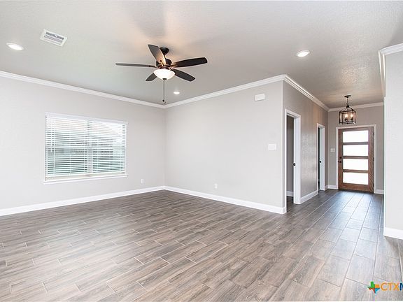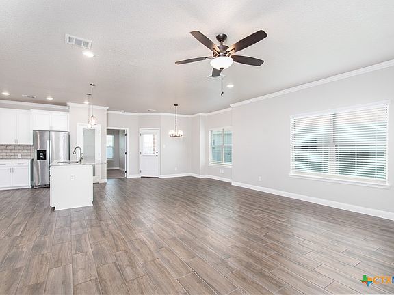 This single-story home in Belton ISD offers a clean, modern layout with generous space in all the right places. Built in 2020, it features an open main living area with wood-look tile, crown molding, and plenty of natural light. The kitchen gives the home a true focal point with its generous island and granite countertops, flowing comfortably into the living and dining spaces.