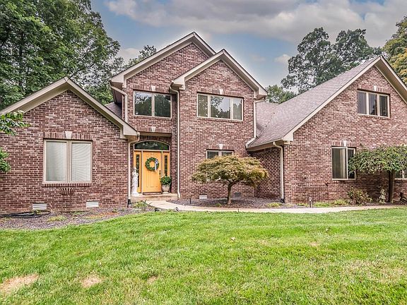 This stately quality built all brick home sits at the end of Rush Ridge on 2.72 acres adjacent to Hoosier National Forest and Lake Monroe. This one and a half story over a full walk out lower, 3 bed, 3 bath, oversized 4 car garage with workshop area provides the ultimate in privacy and tranquility for peaceful inside out living. As you enjoy this amazing location you are only 6 miles from the intersection of 3rd St & Hwy 446 near all the east side amenities, IU Health and the IU campus. Entering the foyer with 17’ ceiling that carries to the living room you notice the great light provided by numerous oversized windows and rich woods. To the left is a hallway to bedrooms 2 and 3 with a full bath in between the bedrooms yet convenient for guests. To the right is your dining room which also has access to the kitchen. The living room with soaring ceiling and fireplace is open to the kitchen with eat at center island and additional eat in area. The eat in area opens to your backyard and spacious multi-tier back deck that over looks the rear patio. The primary en suite is up with a gorgeous loft area for an office or library overlooking the living room. Entry to the primary suite the bedroom is great size which opens to the double vanity, step in shower, jetted tub, walk in closet, sitting area and more closet space! Heading down stairs to the lower level you will find additional storage, full bath, and craft room. The family room with fireplace is open and spacious providing flex space for you to use as what fits your needs while accessing the lower rear patio. As you walk through the home you feel how solid it is and the quality build. A great opportunity to enjoy lake living with privacy and quite while you enjoy the great outdoors but are minutes to town.