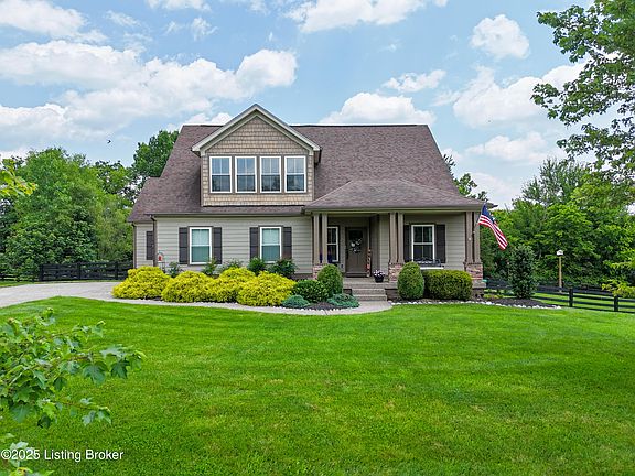 Open House Sunday June 22, 2-4:00pm. Welcome Home to an Entertaining Gem, in the sought after Grand Oaks Subdivision of Crestwood, nestled within the high performing Oldham County South school district. The exterior is a low maintenance Cement Board with brick (It is NOT vinyl siding) and manufactured stone on the porch columns. Giving a Farmhouse vibe. This stunning 5-bedroom, 3.5-bathroom home with vaulted Foyer offers over 2,400 square feet of meticulously designed living space, where thoughtful upgrades and luxurious touches define every level. Step inside and instantly feel at home in the open-concept main floor featuring beautiful flooring throughout, with brand-new flooring in the private office and spacious primary suite. The heart of the home ''an expansive kitchen'' boasts a large center island with bar seating, an abundance of cabinetry, a walk-in pantry, and gleaming stainless steel appliances, including a 2023 gas range. A seamless flow to the newer (2023) double deck, (power washed and protected in 2025 with a matt finish) creating the perfect retreat for relaxing or hosting. All outdoor furniture and the firepit REMAIN with Home (1 Large Dining table, 8 swivel dining chairs, 2 umbrellas, 2 loungers, 1 bistro table with 2 chairs, 2 couches, 2 swivel rocker chairs and firepit- ALL INCLUDED). Imagine gathering with friends or enjoying quiet evenings under the stars. There is a gas hook up for your grill ready to go on the top deck. (no more propane tanks!) Entertain effortlessly in the impressive great room with 9 foot ceilings, a gas fireplace flanked by lighted built-ins, and a massive mounted TV and sound bar - ALL INCLUDED with the home. Upstairs and downstairs, you'll find generously sized bedrooms flooded with natural light and walk-in closets to match.