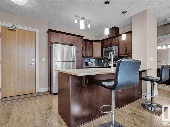 A RARE opportunity to own in a steel & concrete low-rise! This top-floor, 2-bedroom, 2-bath condo offers exceptional quality and modern upgrades throughout. Enjoy an open, sun-filled layout with amazing south exposure and soaring 9' and 10' ceilings. Relax on your PRIVATE balcony and soak up the natural light all day long (with a gas line connection)! The kitchen and bathrooms features quartz countertops, upgraded cabinetry, and sleek finishes, while the living area boasts laminate flooring and large windows that flood the space with light. Stay comfortable year-round with heat pump technology for both heating and cooling. The spacious primary suite includes a walk-through closet and full ensuite, plus there's a second bedroom and bath for added convenience. Comes with an underground parking stall for security and ease. Perfectly located near West Edmonton Mall, Costco, groceries, coffee shops, Whitemud, Henday, and so much more. Don't miss your chance!