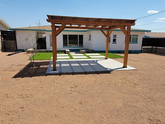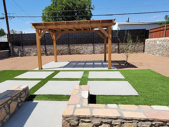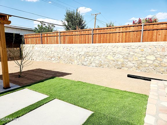Step outside to a private backyard with a pergola, landscaping, and a new metal privacy fence with a matching side gate ideal for relaxing or entertaining.