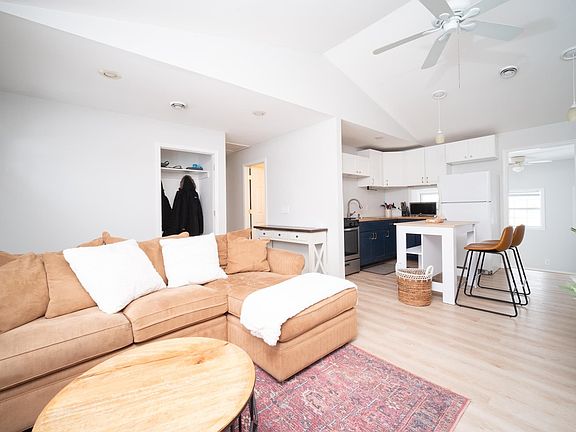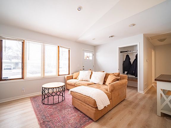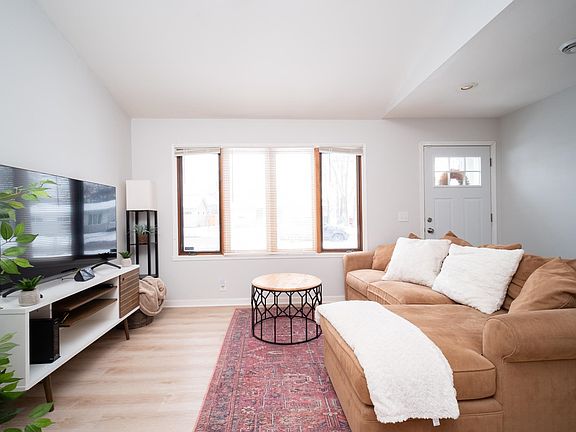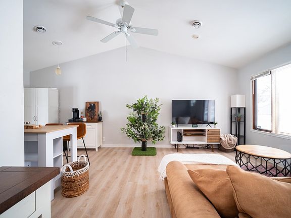 Welcome home to this adorable, move-in-ready, ranch style home! This completely remodeled, open floor-plan home has more space than it appears--offering over 1,100 sq ft of living space. This house features fresh neutral paint and new light wood colored LVP flooring throughout. You'll enter into the living room that has vaulted ceilings that's open to the eat-in kitchen. The spacious kitchen features two-toned white and navy blue cabinets and an island with space for barstools. The moveable island stays with the house! In the rear of the house you'll find a nice bonus room that's filled with windows and natural light--this space has endless possibilities to be used as a family room, dining room, office, playroom, etc. This multi-purpose room has a sliding glass door that leads to the concrete patio. The natural light continues in the laundry room that features LOTS of windows, cabinets and storage space. The house has two generously sized bedrooms and one full bath. Enjoy the 1.5 car ATTACHED garage--a rare find! The garage is insulated and drywalled and has a second overhead garage door that opens to the backyard. The backyard is mostly fenced and has a shed for any extra storage needs. You don't want to miss this one!
