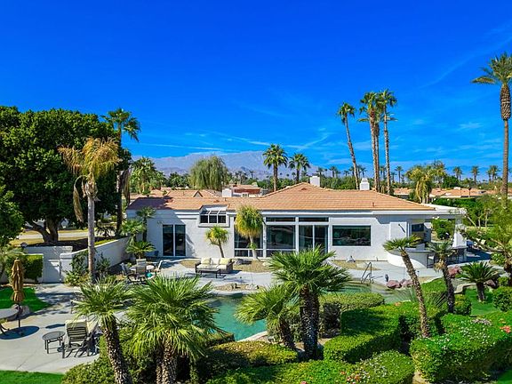 Truly a rare opportunity to own the crown jewel of Desert Horizons! This is desert living at its finest! Perched high above the landscape on one of the largest lots in Desert Horizons, this exceptional home captures the best panoramic views in the community stretching across the lush green fairways to the dramatic mountain backdrop beyond. Dramatically detailed this residence blends sophisticated style with warmth and comfort. Every space showcases the views, custom-quality finishes, creative uses of tile, granite, and stone, and an inviting calming palette. The unique floor plan flows from the great room into the kitchen and living room. With impressive soaring ceilings, gleaming tile floors, skylights and expansive floor to ceiling windows that bring the outdoors in. Two fireplaces anchor the family room and the living room, while the third fireplace is in the expansive main bedroom. The large gourmet kitchen complete with stainless steel appliances and rich wood cabinetry will delight even the most discerning chef. The private primary suite offers a peaceful retreat with a walk-in closet, spa-inspired bath, and captivating views through large sliders and windows and a cozy fireplace.This home has 4 bedrooms all with on-suite and updated.Step outside to an entertainer's dream patios featuring a sparkling pool and spa, outdoor bbq area, beautiful landscaping with so much space. All perfectly positioned to take in the sweeping golf course and mountain vistas. The dramatic landscape lighting completes the ambiance for cool, romantic desert nights.The Premier View Lot in Desert Horizons Country Club!