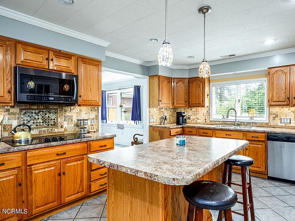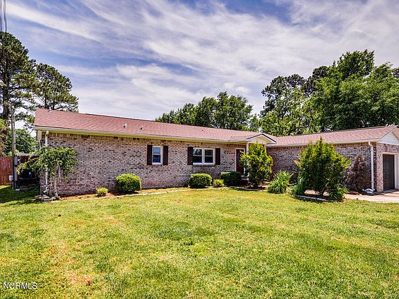 This charming brick ranch-style home features 3 bedrooms and 2 bathrooms. The kitchen is equipped with an island, stainless steel appliances including a double oven, microwave, refrigerator, and dishwasher, tiled flooring and a backsplash The dining room has bead board detailing, while the family room offers built-in shelves and a fireplace. Laminate flooring is found in the dining, family room, hallway and primary bathroom. The bedrooms are spacious, and there is a large fenced backyard with a stamped stone patio and shed for storage.