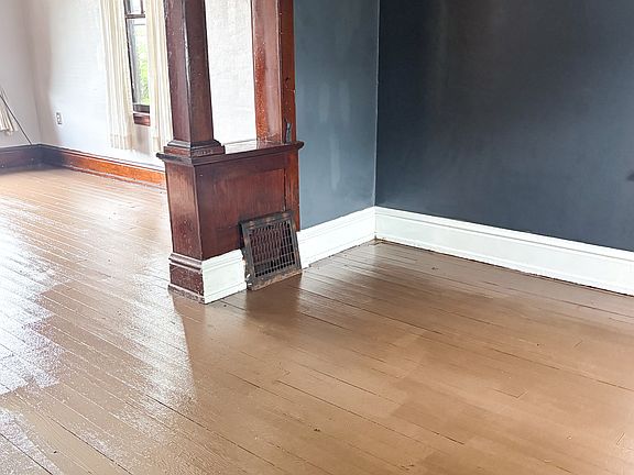 Nice-sized 2-story brick home. Handsome front porch opens into foyer. Living and formal dining room with freshly painted hardwood floors separated by woodwork and columns. L-shaped eat in kitchen with blue-gray painted cabinets and built-in seating for a dining table. Fridge, gas oven range, microwave, and dishwasher all included! Half bath has laundry hookups for a stackable unit. Upstairs is a master bedroom with painted wood floor and big windows and 2 smaller bedrooms with new carpet. Full bath has combo tub/shower and extra storage. Second set of laundry hookups in the unfinished basement! Back yard faces second house at rear of property. On-street parking in front.