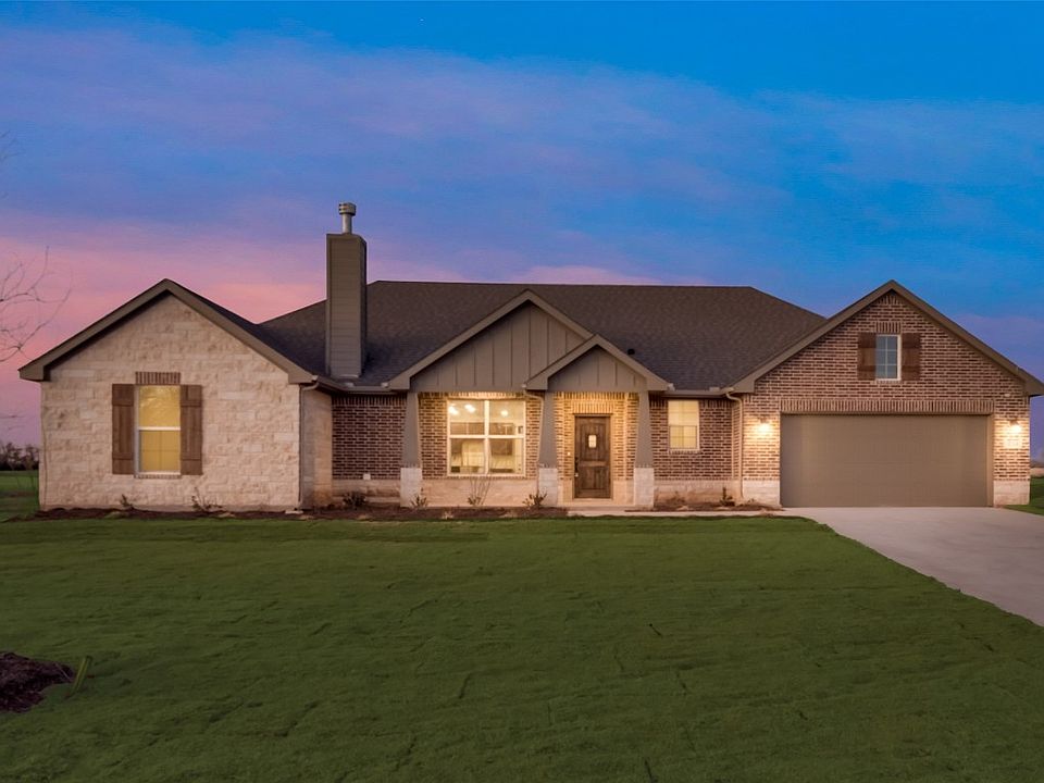The four-bedroom Caddo floor plan is designed with entertaining in mind. Pass through the covered porch to see a stunning open gathering space that combines the family room, dining area and gourmet kitchen. An oversized island serves as the centerpiece of the space allowing you to command the room while you cook. A door to the backyard extends your entertaining and adds year-round flexibility facing the cozy fireplace at the opposite end of the main living space. The owner's suite in the back right corner behind the garage accessible through a small back hallway and includes double vanities in the bathrooms, a separate water closet and a large walk-in closet. The laundry room is located directly across the hall from the owner's suite making for easy chores or a quick drop on the way in through the garage. Three more bathrooms are located on the opposite side of the home connected by a secluded hallway and sharing a full bathroom. Each of the three has a large closet with double doors.