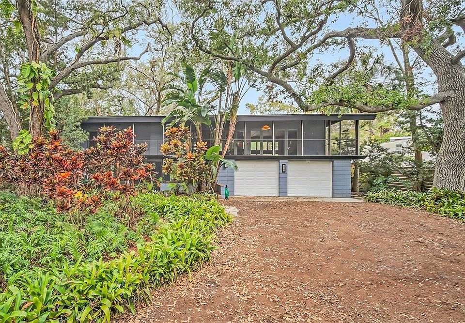 One or more photo(s) has been virtually staged. Now available for $829,900, this remarkable home has been significantly reduced from its original price of $895,900, presenting an exceptional opportunity to own a true architectural treasure. Nestled on a spacious 0.31-acre lot, this Glenn Q. Johnson, 1954 Birdcage House remains the most authentically preserved of its kind. With three bedrooms and three bathrooms, it retains its original charm, featuring cedar wood-paneled walls and ceilings, and terrazzo flooring on the lower level. The aluminum screen frames, accordion-style aluminum and glass doors, and over 1,000 square feet of screened living space across two levels all contribute to the home’s distinctive mid-century character. Storage was thoughtfully integrated into the design, with elevated cabinetry and closets—compensating for the absence of an attic—while the roof boasts solid white cedar tongue-and-groove planks. Over the years, thoughtful upgrades have been undertaken to maintain architectural integrity, including a custom-milled roof and fascia replacement, reinforced steel tube roof supports, handcrafted white oak stairway and landing. Among its standout features is the converted two-car garage, a rare addition among Birdcage Houses, transformed from a north-facing carport in 1997 to a full garage opening to the south. In 1998, a picturesque swimming pool with waterfall and fish pond was introduced, complemented by decking, planters, and lush landscaping. From the arial views, the site looks like a forested landscape. Central air was discreetly installed on the second floor in 2002, with ductwork seamlessly concealed behind custom-milled clear cedar, ensuring harmony with the home’s original materials. The first-floor bedroom received a ductless mini-split air system in 2015, replacing an earlier wall unit. Adding to its charm, a vibrant wooden “catwalk” now bridges the east and west second-story screened porches, enhancing both form and function for your balanced little four legged friends. Enveloped by thriving plant life and equipped with a sprinkler system, this is the most heavily wooded Birdcage property, offering peaceful views of a small natural lake to the west.