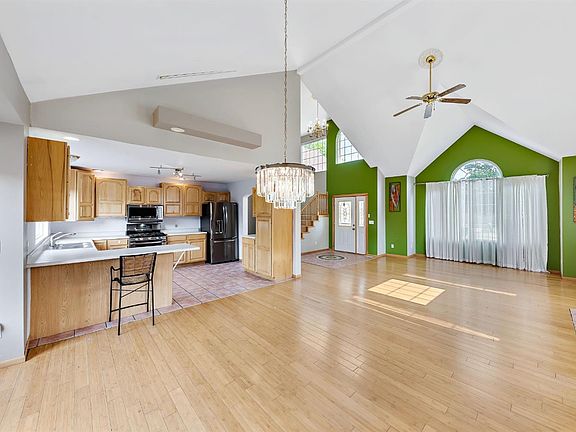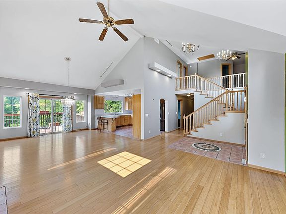 Spacious home off of Duck Creek Golf Course. Customize this home to meet your needs! Main floor features open concept, cathedral ceiling, fireplace in living room, wood flooring and access to large deck. Kitchen is cozy with great views of backyard. Master on main has trey ceiling, large walk in closet and en suite PLUS sliders to access deck. Guest bath and laundry finish off first floor. Upstairs features 3 large bedrooms and full bath. Walk out basement needs flooring to instantly add over 1000 square feet to this 2 story home.