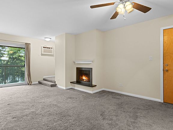 Charming top floor condo with gorgeous views of Sunset Meadows Park is ready for a new owner! Beautifully updated 2 BR, 1 BA condo with a prime corner location. Spacious living areas feature fresh paint throughout, complemented by modern farmhouse doors and 2" blinds that add a touch of style. The inviting living room is anchored by a cozy fireplace, perfect for relaxing or entertaining. Eat-in kitchen features custom maple cabinetry with brushed nickel hardware, stainless steel appliances, subway tile backsplash, stainless sink with a gooseneck faucet and a wood laminate floor adding warmth and character to this well-designed space. The updated bathroom showcases a clean, modern aesthetic with a white Shaker vanity, quartz top and a three-part medicine cabinet. Brushed nickel fixtures and stone -finish tile flooring enhance the contemporary look. Generous closet space, including a deep hall closet with custom built-ins, provides ample storage for all your needs. Slider access leads to an expansive balcony, surrounded by mature trees for ultimate relaxation and outdoor enjoyment. This unit also includes an adjacent private storage room. Additional features: 2 exterior parking spaces, convenient laundry facilities and an HOA fee that covers both heat and water. Located within minutes to schools and parks plus countless shopping and dining options. This is more than a condo; it's a place to call home!