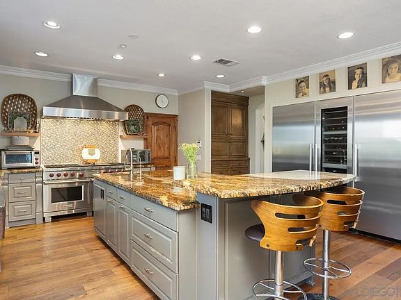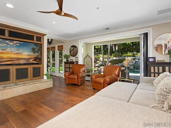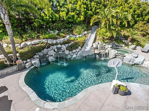 Resort-style 6BR/4.5BA luxury home with 3-car garage on a quiet cul-de-sac in prestigious gated Sandalwood! You'll LOVE the rebuilt French country kitchen with oversize island, copper sinks, Miele fridge & freezer & wine fridge, 6-burner Wolf range, two dishwashers and a roomy pantry. The kitchen opens to a generous family room with fireplace and LaCantina doors opening to backyard. The master suite boasts a fireplace, private balcony, and spacious bath with large oval tub, dual showerheads & sinks, and a huge walk-in closet. Vacation in your own immense backyard: pebble pool with 30-foot slide, hot tub, waterfalls, "firewall", rustic conversation-piece fireplace, outdoor kitchen/bar (4-burner stovetop, BBQ, fridge, water, TV), batting cage, fruit and avocado trees, all backing to a walking trail! Don't miss the paid-for solar, dual tankless water heaters, dual washer/dryers, RV parking, sound system, security cameras, and more!