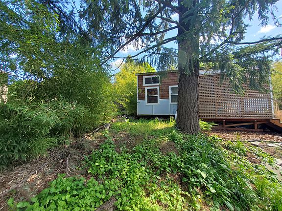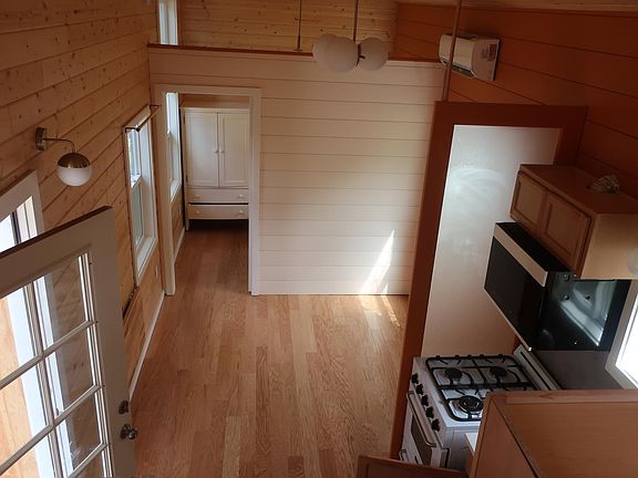 The total space is 350 sq ft with a large loft for storage, a fully equipped kitchen with quartz counters, full bath with normal flushing toilet, gas range and microwave. There is a washer and dryer exclusively for the tiny house use. The house has a super efficient mini split system for heating and cooling, a built in queen bed frame (requires mattress and boxspring), 14' arched ceiling, and beautiful, natural tongue and groove walls and ceiling throughout. Hardwood oak flooring, gas operated on demand water heater, and a great covered cedar deck. There are lots of windows for natural lighting.