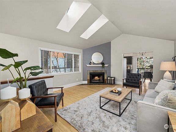 Prime location & tasteful updates meet in this contemporary Wedgwood home. With an ideal layout, the top floor living area provides for privacy & a natural light filled living space. Home features open floor plan, vaulted ceilings, skylights, wood burning fireplace, & primary suite w/ private balcony. The updated kitchen w/ dining space features newer appliances, granite counters & access to large multi-level entertainment deck. Entry level has new vinyl plank flooring, two bedrooms, full bath, attached one car garage w/ W&D & additional storage. Freshly painted throughout, this home is move in ready! Ideally located just minutes away to UW, U Village, Greenlake, Wedgwood, Maple Leaf & Dahl field/park across the street.
