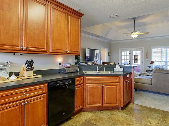 Step into the inviting living room, where a vaulted ceiling, plush carpeting, and a ceiling fan create a cozy yet open atmosphere. French doors lead to a screened-in back porch, perfect for enjoying serene views of the backyard pond. The kitchen is open to both the living and dining areas and features tile flooring, black appliancesincluding a stove, refrigerator, microwave, and dishwashera peninsula for added prep space, and abundant cabinetry and counterspace to meet your culinary needs.