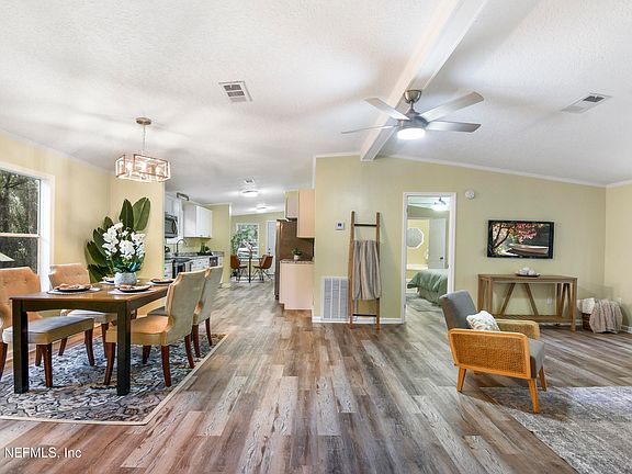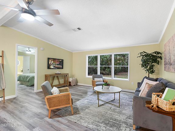 Freshly renovated and nestled on over an acre of land, this 3 bed/2 bath home could be your own private oasis! Featuring a brand new metal roof, HVAC system, updated appliances & more! Walking through the front door, you will find a beautiful open floor plan with spacious living area, dining space and kitchen, completely renovated with new countertops and cabinets. In the primary suite, you'll find a charming double- door entrance into the private bathroom, with a large soaking tub and separate tile shower. The second and third bedrooms share a bathroom with a shower-tub combo. Outside, you'll find new decks and a nicely sized storage shed. You won't want to miss this beautiful Yulee home!