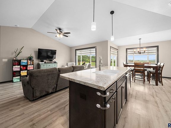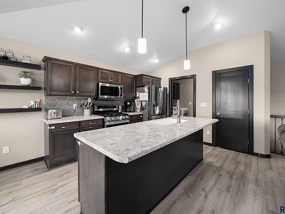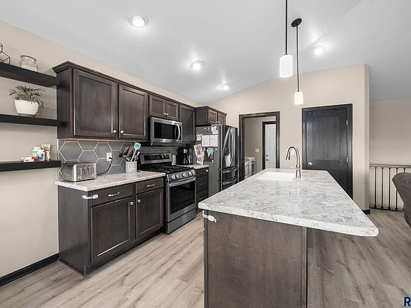 Step into this like new home built in 2021, offering a seamless blend of modern style and functional design! The main level showcases an open-concept floor plan highlighted by a showstopping kitchen featuring sleek stainless steel appliances, a gas oven, center island, contemporary tile backsplash, and spacious countertops - perfect for entertaining or everyday living. Durable vinyl flooring runs throughout much of the main level, providing a clean, cohesive look. The dining area includes a slider door that leads out to a deck with open views, ideal for enjoying quiet mornings or evening sunsets. Also on the main floor is a convenient laundry area, two bedrooms - including a beautiful master suite with a walk-in closet and a luxurious tiled walk-in shower with upscale finishes and two full bathrooms thoughtfully designed with modern touches. Downstairs, the expansive lower level features a large family room offering flexible space for a play area, media zone, or hobbies. Two additional bedrooms and a third full bathroom complete the lower level, making this home ideal for families or guests. Furnace, a/c, water heater and more are just like new since the home was built in 2021. Outside, the fully fenced backyard is perfect for kids and pets to safely enjoy, and the underground sprinkler system helps keep the yard looking great with minimal effort. This home has everything you need space, modern styles, and comfort. All in a move-in ready package and ready for you!