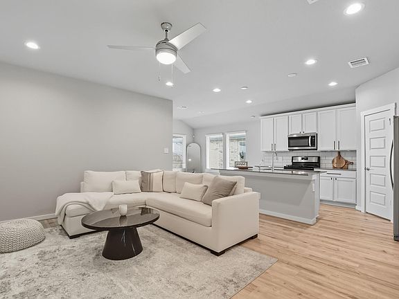 This single-story home in Lakeview Retreat. Situated on a landscaped lot with no rear neighbors, it offers a covered patio and fenced backyard. Inside, the open-concept layout includes high ceilings, upgraded vinyl plank flooring in main areas, plush carpet in bedrooms, and tile in wet zones. The kitchen boasts quartz countertops, tile backsplash, tall white cabinets, stainless steel appliances, and a large eat-in island. The dining area has walls of windows and backyard access. The primary suite includes a dual-sink vanity, oversized walk-in shower, and spacious closet. Secondary bedrooms are well-sized and private. Additional features: Rinnai tankless water heater, HERS energy rating, USB outlets, and Smart Home Package. Community amenities include pool, splash pad, trails, and green spaces. Convenient to Grand Parkway and Westpark Tollway.