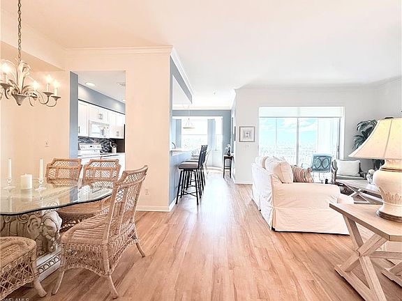 Top Floor Condo (Common Elevator in Building) with incredible view of golf course, water, preserve and sunsets. You never have to worry about someone living above you. This 2 bedroom / 2 bath condo is full of natural light coming in from back windows in kitchen and sliding glass doors in the living room. Homeowners love this open floor plan. Main living area (living room, kitchen and dining room) has vinyl plank flooring. Current homeowner updated the kitchen with soft close Shaker Cabinets, glass tile back splash, large single basin sink and quartz counter tops. Guest bedroom and guest bath can be closed off by pocket door to create suite for those visiting. Guest bath has tub/shower combo. Primary bedroom is very spacious and has updated en suite bathroom. Updates to primary bath include new double sink vanity with quartz counter tops, new mirrors and lighting, remodeled shower with frameless shower door and extended glass wall. Back screened lanai has tile floor and both back screen and side screen to make area fell open and spacious. Across hall from front entry is X-large storage room deeded to condo owner. HVAC was installed in 2020 and hot water heater installed in Dec 2021. Located in the desirable gated community of Naples Heritage Golf and Country Club you are buying into a lifestyle. Enjoy the gorgeous 18 hole golf course, putting green, driving range, clubhouse w/pro shop, resort style community pool with poolside cabana & bar, fitness center with on site instructors, tennis courts, pickleball courts, bocce and walking trails. Members can enjoy dining inside the clubhouse in main dining room or at bar and grill. If you prefer to dine outside members can choose between pool deck cabana or the veranda on back of clubhouse. Naples Heritage is extremely convenient to I-75 and Just minutes from downtown 5th Ave & beaches.