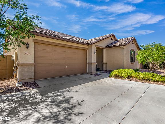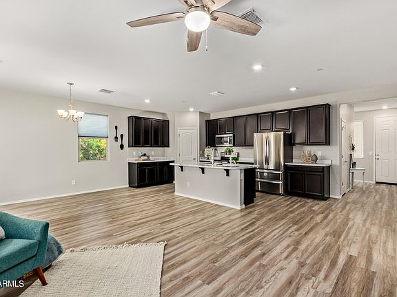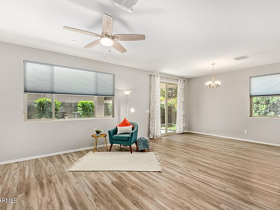 This adorable 3 bed/2 bath, single level, split bedroom, open floor plan home boasts a modern feel w/ its 9' ceilings, upgraded oversized Kona colored kitchen cabinets, walk-in pantry, ample storage, tons of counter space w/ a marble look, stainless steel appliances, a large island w/ a breakfast bar & neutral laminate wood-look floors throughout the whole home (carpet is only in the 3 bedrooms). The full primary bathroom features double sinks, tub/shower & a private toilet room. The large, spacious primary suite is the perfect retreat after a long day & the split floor plan offers added privacy. With walk-in closets in every bedroom, you'll have plenty of space to store your belongings. The ample storage continues w/ linen & coat closets, ensuring you have room for all your essentials The 2-inch wood blinds throughout the home add a touch of elegance and privacy. The separate laundry room makes chores a breeze. The backyard has a covered patio and is fully landscaped with beautiful bushes & real grass that runs the full length of the side yard. This home is centrally located near the US 60 and the 101 freeway!! Restaurants and shopping are close by! There is a community pool as well as a playground. Don't miss the opportunity to make this house your dream home. Come and experience the Villas at Sonoran Ridge, where comfort, style, and modern living come together. Contact us today to schedule a showing and make this home yours!