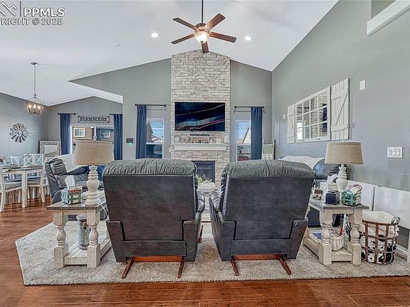 Welcome to your dream home in the highly sought-after Glen at Widefield neighborhood! This stunning stucco Savanna model by Windsor Ridge offers the ease of main-level living with numerous upgrades throughout. Once inside, you will appreciate the tiled entryway, vaulted ceilings, wide-plank wood floors, newer interior paint, upgraded light fixtures, ceiling fans, AC, and a gas fireplace with new stacked stone surround and wooden mantle. The open concept living and dining rooms seamlessly connect to the upgraded kitchen (highlighting granite countertops, stainless steel sink and appliances inclusive of a gas range, wine/beverage refrigerator, pantry, glass tile backsplash, and ample cabinetry for all your culinary needs. The main level features a serene primary suite with private access to the backyard patio, a luxurious 5-piece upgraded ensuite bathroom with feature wall, custom mirrors, double vanity, soaking tub, skylight, walk-in shower, bidet, and walk-in closet. A second bedroom, upgraded full bath, ample storage, and laundry/mud room finish out this level. Make your way downstairs to appreciate the fully finished basement highlighting a rec room, movie projector and screen for your entertainment needs, and ample room to play or unwind. You will also find two more additional bedrooms, a third full bathroom, and a spacious unfinished storage area, ideal for a hobby space or workshop. Step outside to enjoy the covered front porch and the fenced, backyard oasis. Gather under the pergola or stay warm by the fire pit or propane heater to enjoy evenings year-round. There's even a dedicated dog run for your furry friends. Located just steps from trails and the neighborhood playground, mere minutes from shopping, dining, military installations, schools, businesses, and the Colorado Springs Airport, commuting is a breeze. Do not miss the chance to make this dream home yours. Schedule your showing today!