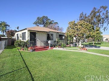 Charming Commerce Duplex. Very maticulate lawns and walkways with a variety of fruit trees, to include 4 mango trees from California, Hawaii, Jalisco Mexico and Manila Philippines: Orange tree, Lemon tree, sweet Guayaba tree (Japanese) and sweet persimmons tree (Japanese) also a cactus plant. The main home is three bedrooms with 2 baths. The front room is the living room that opens up to the kitchen with florescent lighting and lots of counter space and a eat at bar. Their is a step down from kitchen to a newly painted with new base boards and laminate flooring dining area and large family room. Also a non permitted room that once was a patio is now an extra room which has new paint, new laminate flooring and baseboards. The main home has a laundry room fresh paint and lots of storage. The smaller unit has its own yard and seperate address and a gated area. Inside it has a kitchen with stove and frig that will stay. Also it has an open room with fresh paint, new laminate floors and base boards as well as the bedroom. The bathroom has a new vanity new floors and paint. The backyard is a great size for entertaining and it has a cement pad for parking a vehicle off the large gate that opens to the alley. Commerce has Free Trash pick up and free buses. This is a great investment.