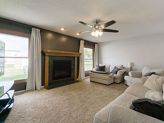 This move-in ready two-story home is located on a quiet street in a family-friendly neighborhood, close to Westfield Elementary, Bowman Woods Elementary, Hy-Vee, and Scooters Coffee. The main level features a welcoming mix of carpet, hardwood, laminate, and luxury vinyl plank flooring, a cozy fireplace, and a convenient half bath. The kitchen includes laminate flooring, laminate countertops, stainless steel appliances, and a pantry, with all appliances staying with the home. Upstairs, the spacious primary bedroom offers carpet flooring, a walk-in closet, and an en-suite bath with luxury vinyl plank floors, solid-surface counters, and a one-piece shower, along with two additional bedrooms and a second full bath. The finished lower level includes a theater room, workout area, and laundry room. Outside, enjoy a patio overlooking the fenced backyard, along with a storage shed and pool — perfect for relaxing or entertaining.