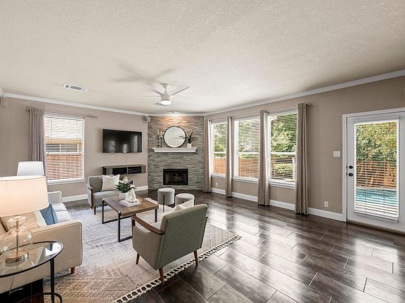 This gorgeous 4-bedroom home with a pool, located in highly desirable Legend Oaks, features a spacious and versatile layout. The floor plan includes three living areas—two downstairs and a large game room upstairs—offering plenty of room for work, play, and relaxation. Stylish updates throughout the home feature modern tile and luxury vinyl plank flooring downstairs, along with updated ceiling fans, light fixtures, and plumbing fixtures. The beautifully remodeled kitchen boasts white cabinetry, granite counters, stainless steel appliances, an island, and a walk-in pantry. The family room is warm and inviting with a fireplace framed by a modern tile surround. Thoughtfully designed for everyday living, the home also provides excellent storage, with multiple walk-in closets (including two in the primary suite), built-ins in the laundry room, abundant kitchen cabinet and counter space, and additional linen closets. Step outside to your private backyard oasis featuring a sparkling custom pool and an oversized hot tub that fits up to 10–12 people—perfect for hosting weekend gatherings or cooling off on hot summer days. The spacious lot also features several mature trees that enhance the setting with natural beauty. Recent upgrades include a roof replacement in 2024 and a recently replaced pool pump for added peace of mind. Residents enjoy access to fantastic neighborhood amenities like a community park, pool, and playground. Conveniently located near major highways, this home is just minutes from shopping and dining at Escarpment Village and Arbor Trails, as well as scenic greenbelts and local parks for outdoor enjoyment.