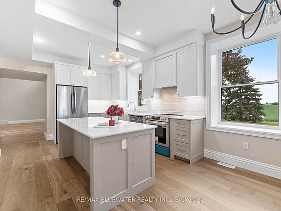 Experience refined country living in this fully renovated brick estate, where modern sophistication meets timeless elegance. Set on a show-stopping 1.6-acre lot, this home has been meticulously redesigned with an uncompromising commitment to quality and style-no detail has been overlooked. Featuring three spacious bedrooms and two and a half luxurious bathrooms, the residence offers a main-level primary suite with a spa-inspired five-piece ensuite, a four-piece bath upstairs, and a stylish two-piece powder room for guests. The lower level provides flexibility for additional bedrooms and a bathroom if desired, and includes a drywalled recreation space ready to finish to your personal taste. The gourmet eat-in kitchen is a true showpiece, adorned with quartz countertops, new high-end appliances, custom cabinetry and finishes, and a spacious pantry. Just beyond, the inviting living room centers around a charming fireplace and features an elegant coffered ceiling, creating the perfect ambiance for both quiet evenings and sophisticated entertaining. The mudroom adds everyday convenience and leads into the jaw-dropping great room, showcasing hardwood floors, 18-foot shiplap cathedral ceilings, and a stunning custom staircase. The main-floor laundry room is equally impressive-spacious, functional, and beautifully designed. No detail has been spared: a new septic system, drilled well, metal roof, furnace, central air, insulation, and fully updated mechanical systems-among many other improvements-ensure total comfort and peace of mind. Step outside to your covered front porch, finished with durable composite decking, and enjoy serene views of Lake Huron shimmering on the horizon. Whether you're sipping coffee at sunrise or hosting guests at sunset, the setting is truly breathtaking. Located just minutes from Bayfield, this home offers the perfect blend of tranquility, luxury, and convenience. Discover where elegance meets the countryside-schedule your private tour today.