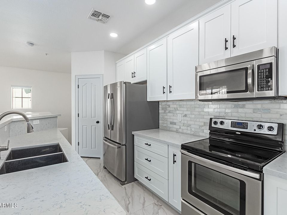 FULL REMODEL. Take a look at this fantastic condo in the highly desirable Hunter Ridge! Inside this 2 bedroom residence you'll find a spacious open floor complimented by tall ceilings and glossy tile flooring. The immaculate kitchen features white shaker cabinets, tile backsplash, solid surface counters, stainless steel appliances, and a 2-tier island. The primary bedroom hosts a full ensuite with dual sinks and a walk-in closet. From the lovely balcony enjoy fabulous South Mountain views while sipping your morning coffee. This home includes an attached garage. This awesome community offers a resort-like pool, playground, grilling ramada, lush green areas, and more! Excellent location close to restaurants, markets, and the Legacy Plaza.