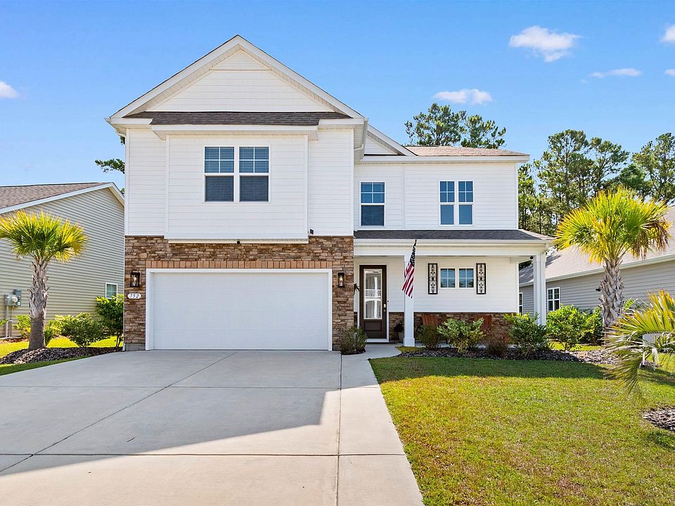Move-in ready and furnished! Welcome to this beautifully designed two-story Belfort model home, nestled in the serene community of Hidden Brooke—known for its expansive green spaces, peaceful lakes, and inviting atmosphere. With its spacious layout and upscale finishes, this home offers comfort, convenience, and elegance throughout. Step on to the charming front porch where you'll enjoy tranquil lake and sunset views; perfect for greeting guests or relaxing at the end of the day. Inside, the main level is thoughtfully designed for everyday living and entertaining. As you enter the home, step into the welcoming foyer with a walk-in and under the stair closet, and stylish half bath. Your beautifully designed primary suite is a true retreat, featuring a sitting area, large walk-in closet with custom built-in, and a spa-like ensuite bath complete with a double vanity, glass-enclosed walk-in shower, and generous linen closet. The open-concept kitchen, dining, and living area seamlessly flows out to the screened-in porch with privacy blinds, and an extended patio complete with a large gas grill and built-in gas hookup—ideal for outdoor gatherings. The kitchen is a dream with a large work island, five burner gas stove, stainless steel appliances, beautiful quartz counters, tiled back splashes, plenty of cabinetry and large pantry. Conveniently located just off the kitchen is a drop zone leading to the garage and laundry room with more cabinetry. Upstairs, the home continues to impress with three additional spacious bedrooms, a full bath, and a large loft area that’s perfect for a second living space, office, or playroom and lots more storage! It’s all the little things that make this home special, updated lighting, ceiling fans, window treatments and blinds, fenced private back yard, irrigation system, whole house water filtration system with reverse osmosis at the kitchen sink, on-trend and soothing paint colors, stylish and comfortable furniture and all those storage spaces! Hidden Brooke offers beautiful amenity center with luxury pool, pool house with cabana, work-out room, fire pit and dock for fishing! The Hidden Brooke community is conveniently located to shopping, medical care, dining and just 4.9 miles to the beautiful beaches of North Myrtle Beach. It is conveniently located, within minutes of the commuter route – Highway 31. Why wait to build when you can move in now to this lovely home that already has everything! Very low rate assumable VA mortgage to qualified applicants.
