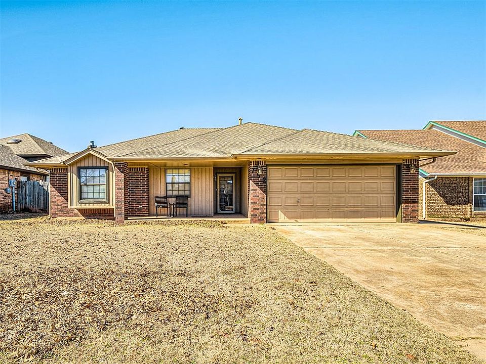 Check out this well-maintained UPDATED and MOVE-IN READY home that is located in the Sunrise Hills community in Yukon. This home has so much to offer! Some of the features include: covered porch; brand new laminate wood flooring in the spacious kitchen and dining room areas; beautiful stained cabinets and built-ins throughout; gorgeous laminate wood flooring throughout the spacious living room area and all bedrooms; tray ceiling in the primary bedroom with beautiful stained wood inserts; painted brick fireplace that goes up to the ceiling that is ALSO shared in the primary bedroom; and so much more! In addition, check out all of the updates that include: updated en suite bathroom with gorgeous walk-in shower with tiled walls and sliding glass door; updated secondary bathroom with tiled walls; fresh paint throughout; and so much more!! The backyard space and large covered back patio is perfect to entertain and host large parties with families and friends. As a BONUS: the kitchen refrigerator and washer and dryer STAY with the home making it the perfect MOVE-IN READY home! This home is definitely a must see! Buyers are to confirm all information including schools.