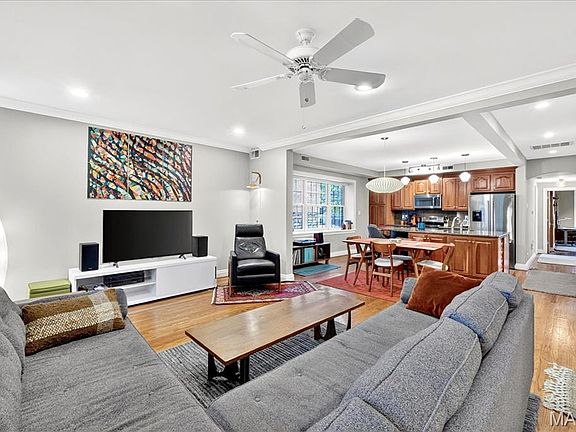 Beautifully maintained first-floor condo in the Moorlands neighborhood’s Buckingham Condos — a timeless Clayton gem. Step into a sunlit, open floor plan where high ceilings, graceful chandeliers and special millwork introduce a home of historic character. Oversized windows with deep sills and crown molding flood the living and dining areas with natural light. The eat-in kitchen is thoughtfully appointed with a center island, custom cabinetry, ample pantry storage, solid-surface counters, stainless appliances and distinguished light fixtures. Through a French door just off the kitchen lies a private office — perfect for quiet study or work. Down the hall discover the 2nd bedroom and a full bath with a relaxing jet tub, then the primary suite with his-and-her closets, a striking archway, Roman shades and a luxurious bath featuring a large vanity with dual sink and custom tile walk-in shower. Additional comforts include NEW HVAC and AC in 2022, in-unit laundry, garage parking and storage locker. Just minutes from downtown Clayton’s shopping, dining and parks — you will not want to miss this elegant, historic-charm condo.
