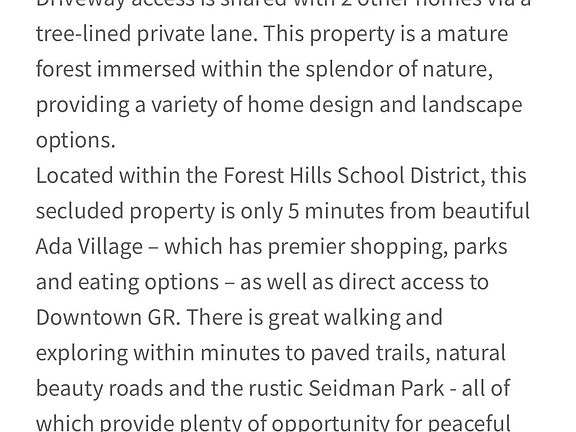 BRING YOUR OWN BUILDER! Split Oak development. Scenic 2.2 Acre wooded, walk-out parcel, located on one of the most scenic natural beauty roads in Ada. Fish-filled Honey Creek with its scenic valley is the backdrop for this hilltop, bring-your-own builder site. Driveway access is shared with 2 other homes via a tree-lined private lane. This property is a mature forest immersed within the splendor of nature, providing a variety of home design and landscape options. Located within the Forest Hills School District, this secluded property is only 5 minutes from beautiful Ada Village (shopping, parks and eating options) as well as easy access to GR. There is great walking and exploring within minutes to paved trails, natural beauty roads and the Seidman Park - all of which provide plenty hikin andr biking options. Property in this area doesn't trade hands very often. All showings must be guided by the agent or seller - please reach out for options and/or questions. Architectural/Landscape design/layout guidance can be provided upon request. Property has been split (4 parcels with road easement)