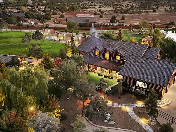 Bordering the scenic Granite Mountain Wilderness, this 24.76-acre equestrian estate captures the essence of refined Western living. Every aspect of the property has been thoughtfully developed to combine luxury, functionality, and the freedom of open land -- all just 7-8 miles from Yavapai Regional Medical Center, top schools, shopping, and Prescott Regional Airport, and within easy reach of Arizona's major equestrian hubs.The 3,998 sq ft two-story residence blends rustic lodge elegance with modern comfort, featuring wood siding with chinking, a shake roof, and timeless architectural character seldom seen in the Southwest. Inside, soaring 20-foot ceilings rise above a magnificent floor-to-ceiling rock fireplace in the great room, while four bedrooms, a large utility room, and an air-conditioned sunroom provide inviting spaces for family, guests and pets. Expansive windows frame panoramic mountain and pasture views, filling the home with light and warmth.Designed for the discerning, yet highly practical horse and livestock owner, the ranch offers 11 irrigated pastures, a five-stall horse barn, large hay barn, and large equipment shop. Facilities include a 120' 160' covered arena, 150' 300' outdoor roping arena, and a 60' 60' covered six-horse panel walker. The property is designed for simple and efficient flow of livestock between pastures and arenas with a state-of-the-art processing/doctoring facility for cutting, cowhorse or roping cattle All panels and fencing are Priefert brand ensuring safety and longevity throughout. The property enjoys direct frontage on the Granite Mountain Wilderness, offering immediate access to miles of scenic riding trails and open country. The Wilderness designation offers the new owner the highest level of protection and confidence that the adjacent land will remain in its natural state. Despite its privacy and rural setting, this estate property is less than two hours to premier equestrian centers in Scottsdale and Wickenburg, and about three and a half hours to South Point Arena in Las Vegas.A rare find in Arizona, and the Prescott area, this estate combines exceptional equestrian infrastructure, luxury craftsmanship, and unparalleled access -- an ideal home for those who demand quality, privacy, and a true Western lifestyle built without compromise.