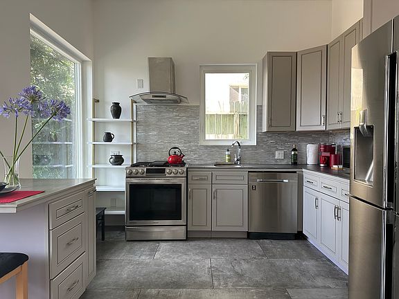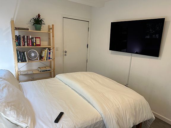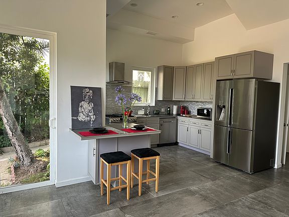This unique furnished rental occupies the lower floor of a single-family residence with ocean views. 12 foot ceilings and large windows allow lots of natural light. The gourmet kitchen has SS appliances. Step through the living room sliding glass door for easy access to the garden and patio. Features for beach lovers include an outdoor shower with hot & cold water, a bathroom with doors to both the outside shower and to the living area and space to store a short surf board. The garage also has room for storage beside a car, second parking spot on driveway. The main bath has an over-sized soaker tub and shower. On-site laundry, sound proofed windows and a fenced yard. Minimum one month stay. Amenities and all utilities included. Minimum 30 day lease. No pets, no smoking or vaping on the premises - no exceptions. A non-refundable $50 fee is due from each potential applicant for processing and credit check. If approved, move-in fees include 1st month's rent ($4400), a refundable $4400 security. Additional refundable deposits: key $50, TV remote $50, and garage remote $50. Move-in total $8950.