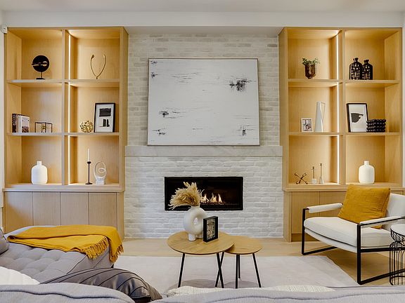 Brick accentsHigh-end finishesFisher and paykel appliancesSpice kitchenCustom shaker cabinetryGreat roomBrick feature wall