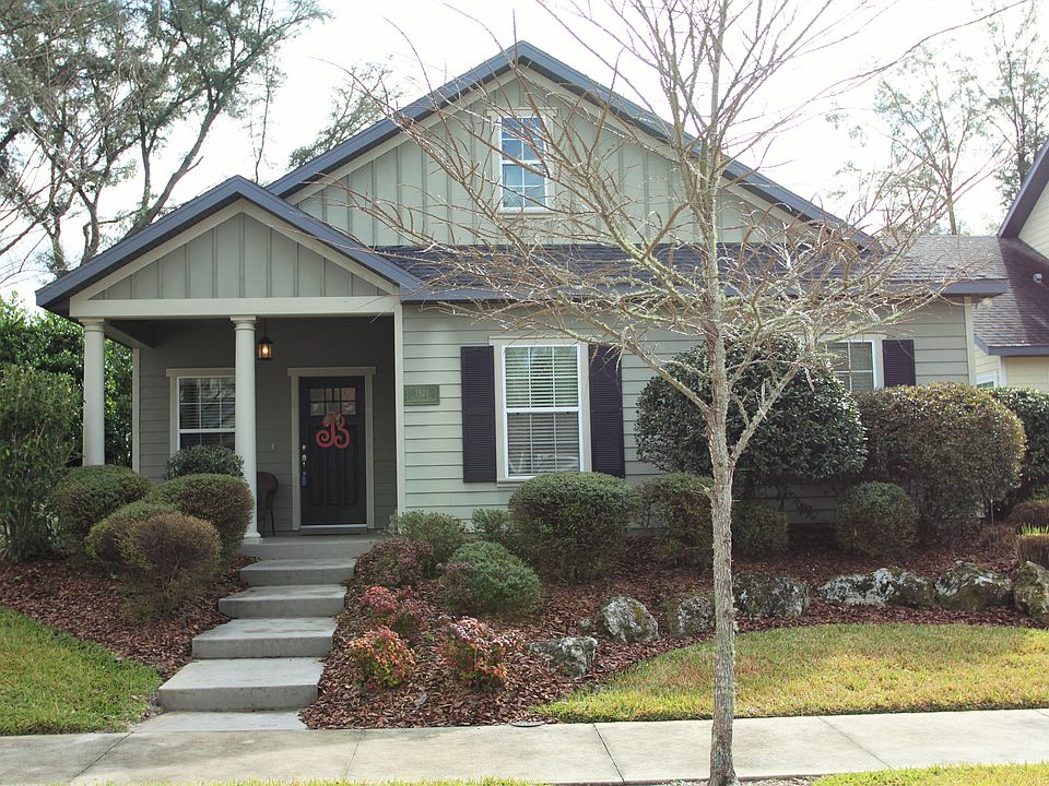 Immaculate Craftsman style home in sought after LongLeaf Neighborhood shows like a new home. This 3BR/2BA home has a very practical computer nook for kids and adults. Open Floor Plan, 18" tile in main living areas, carpet in bedrooms. Beautiful cabinetry, stainless steel appliances, granite countertops and breakfast bar in kitchen, laundry room off kitchen even has a wine fridge! Crown moulding throughout. Master bedroom is roomy with a beautiful master bath - walk-in shower and separate soaker tub, walk-in closet. Lovely screened porch overlooking fenced in, well manicured yard. The tangerine tree in the backyard can feed all the neighbors! Rear entry garage with plenty of storage space. Community offers clubhouse with fitness center, beach entry pool, splash pool and tennis courts. HOA maintains the front and side yards!! Minutes to VA, Shands, UF and I-75. Come take a look today.