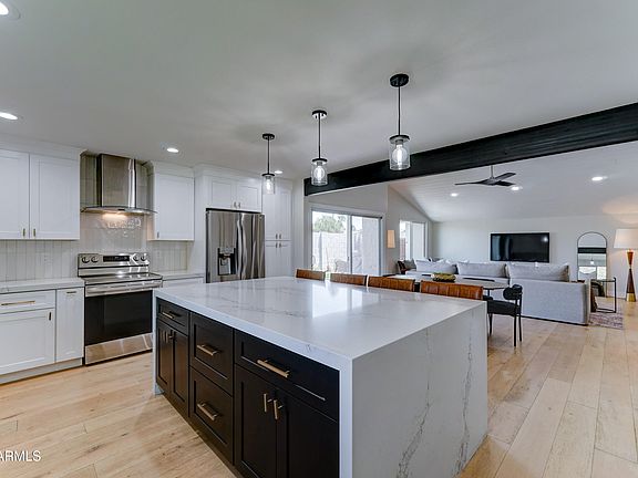 Terrific total remodel in this super 1 level (4 bedroom/2 bath) home in this premier neighborhood in highly desired McCormick Ranch! Soaring high vaulted ceilings, fresh/new light, bright airy finishes, & an open floor plan! Completely updated w/ a new on-trend new kitchen featuring a lg. island w/ designer granite water-fall edge detail & all newer Stainless-Steel appliances! Spacious great room & dining area open to kitchen for a totally functional open floor plan! Newer hardwood flooring, newer windows & newer doors! Primary bedroom is ensuite & features a lg. sliding glass door to the backyard! New AC unit in 2019! Fantastic McCormick Ranch lifestyle w/ easy access to miles of greenbelt bike/hike/walk pathways/ & 2 mins from Paseo Village shopping cntr./LA Fitness/shopping/dining!